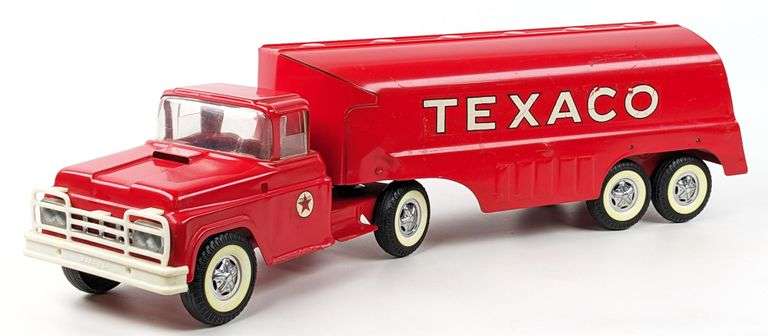 Original Buddy L Texaco tanker truck. The truck is missing the mirror. It does have some decal wear, scuff marks, and minor yellowing to the whitewalls. Displays well overall. Measures approximately 24" long.
