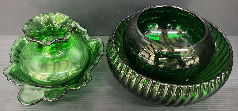 Fire King Forest Green Maple Leaf Candy Dish, Swirl Bulb Bowl, Ruffled Vase And Three Leg Bowl/Candy Dish