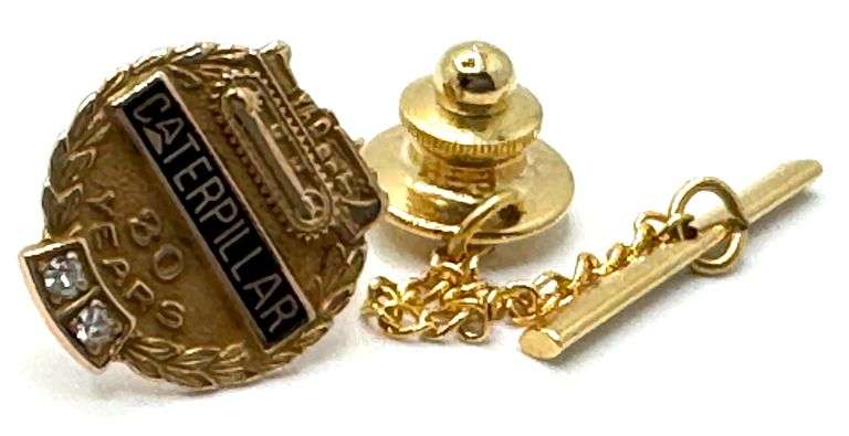 10K Yellow Gold & Diamond Caterpillar 30yr Service Pin, This service pin has two small round diamonds placed and a total weight of 6.3g (Diamonds tested on Presidium Gem Tester II)