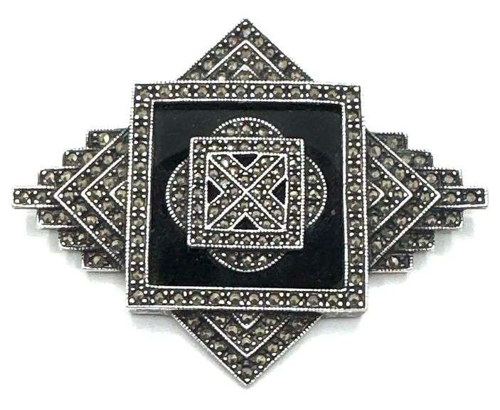 Judith Jack Sterling Silver Black Onyx & Marcasite Brooch, Retro 2000 (514/1000) Brooch. JJ Retro 2000, 514/1000 Sterling on backside. Measures 1.75in x 2.5in and has a total weight of 0.82oz