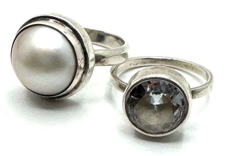 Sterling Silver Faux Pearl and Cut Clear Glass Dinner Rings, Size 10. Both Stamped 925. Combined total weight of 0.52oz
