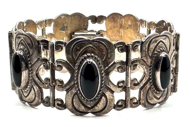 ATI Mexico Sterling Silver Black Onyx Panel Bracelet with Clasp, stamped ATI 925 Mexico. Measures 6.5in long and has a total weight of 2.56oz