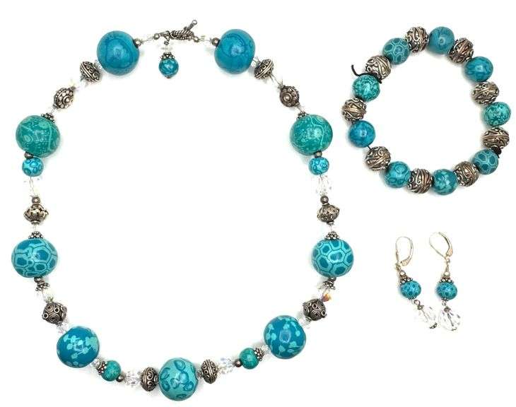 Sterling Silver Beaded Fimo Clay Necklace, Bracelet, Earring Set. Necklace has toggle clasp and measures 17in long, bracelet measures 8in long. (GR2)