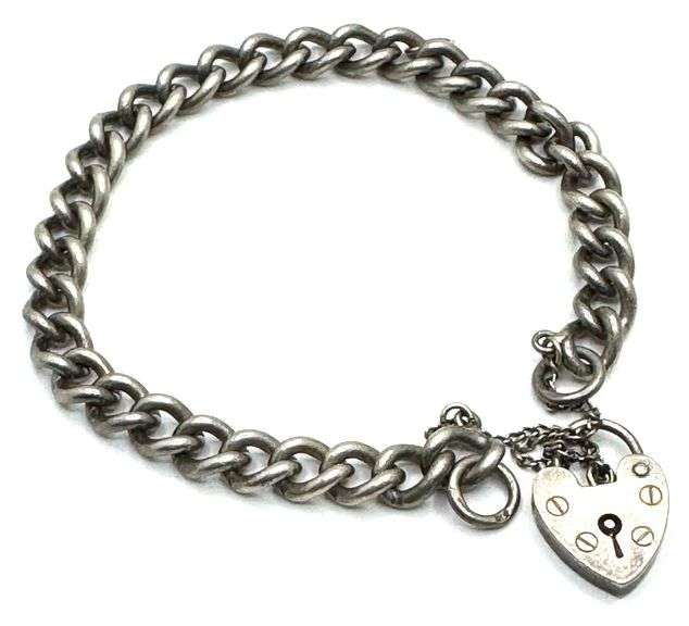 Vintage Sterling Silver Heart Locket Charm and Bulky Link Bracelet, stamped SILVER. Measures 7in long and has a total weight of 0.66oz