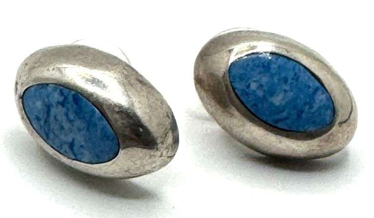 Mexico Sterling Silver Blue Lapis Lazuli Pierced Earrings, stamped Mexico 925 on backside. Measure 0.5in x 0.25in and have a total weight of 0.28oz