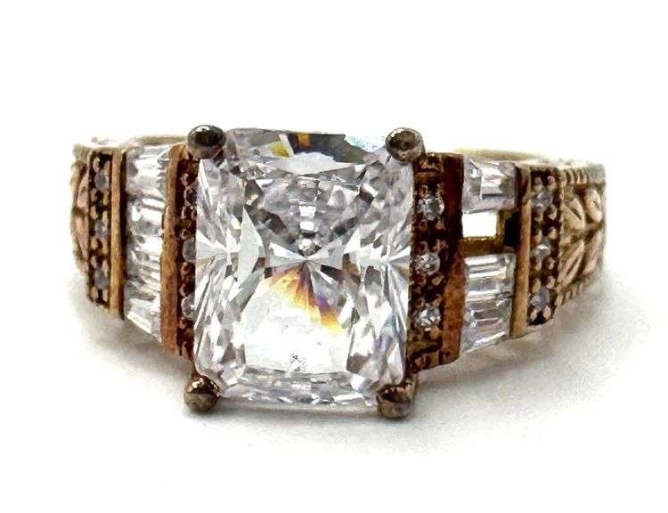 Sterling Silver Clear Quartz Gold Tone Dinner Ring, Size 7. Stamped 925TC on inner ring and has a total weight of 0.14oz