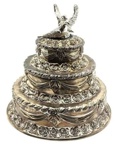 1980's International Silver Co. Silverplate Wedding Cake Velvet Lined Trinket Box, measures 4.5in x 4.5in