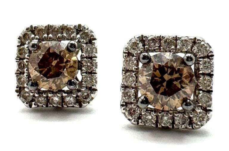 18K White Gold 1/2ct Diamond Stud Earrings, Stamped 18K. Each earring has a total of 16 small round cut diamonds and one center Yellow Diamond. Total weight 1.6g
