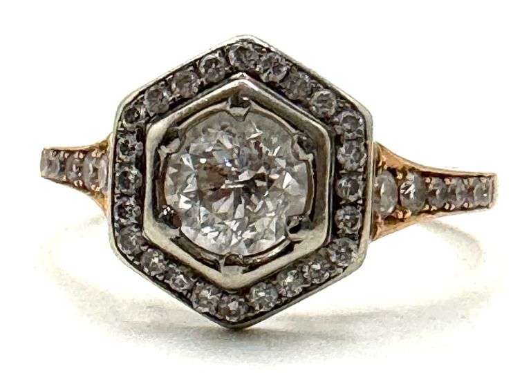 14K Yellow Gold 1ctw Hexagon Halo Diamond Ring, Size 8. This beautiful ring has one round center stone measuring 6.09mm, a total of 11 round cut diamonds down the sides of ring (missing one diamond on side), and a total of 24 small round cut diamonds making up the halo. Total weight of 3.7g