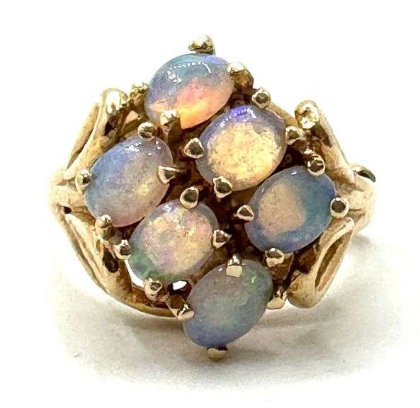 14K Yellow Gold Opal Cocktail Ring, Size 4. Stamped 14K on inner ring, has a total of 6 oval cut opal stones. Total weight 5.4g