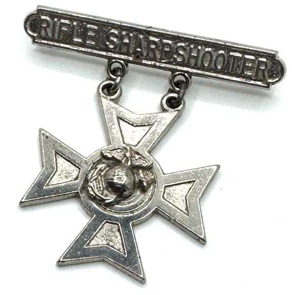 USMC Rifle Sharpshooter Sterling Silver Medal, stamped Sterling Krew on back side. Measures 2in by 2in and has a total weight of 0.57oz