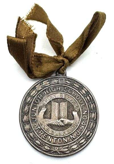 Vtg. Sterling Silver Trenton, N.J. Junior High School Spirit Service Medal, Backside is stamed Hulslander Sterling, FEMIANO MEDAL. Measures 1.25in and has a total weight of 0.41oz