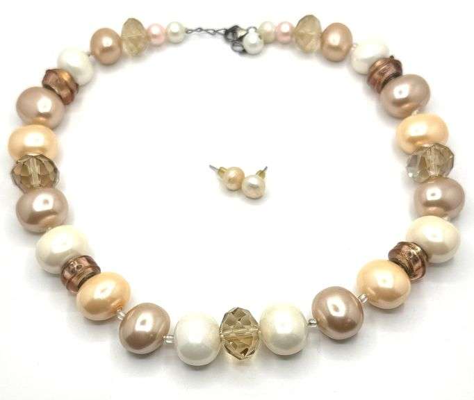 Chunky Faux Pearl and Clear Beaded Necklace and Earring Set, necklace measures 17in long (GR3)