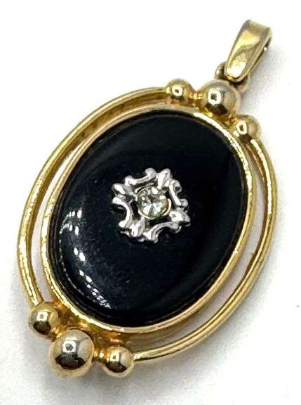 1980's Black Onyx Reversible Pendant, Gold Tone. Pendant measures 1.5in x 0.75in (GR2)
