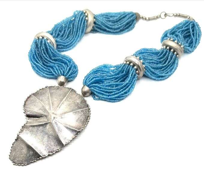 Statement Seed Beaded Multi-Strand and Metal Art Deco Necklace, pendant measures 4.25in x 3in, and necklace is 20 in long