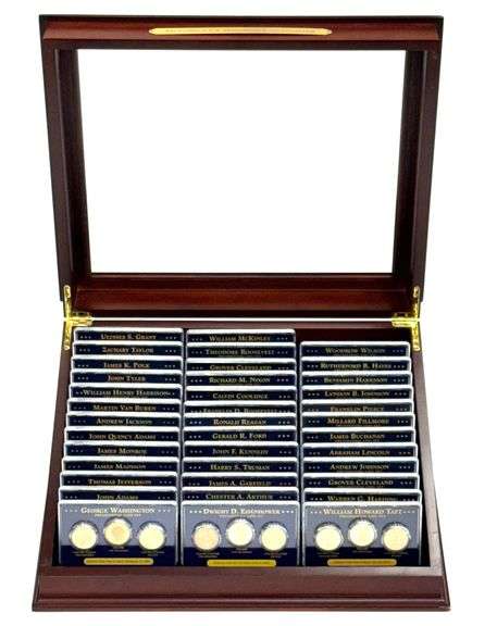U.S. Presidential Coins Collection 38pc Set FV $114.00. This set is missing 4 presidential 3pc coin sets to make it complete. Comes in a beautiful display box measuring approximately 18in x 15.5in x 7in. Each Presidential set includes 3 coins, one from each mint including Philadelphia, San Francisco, and Denver.