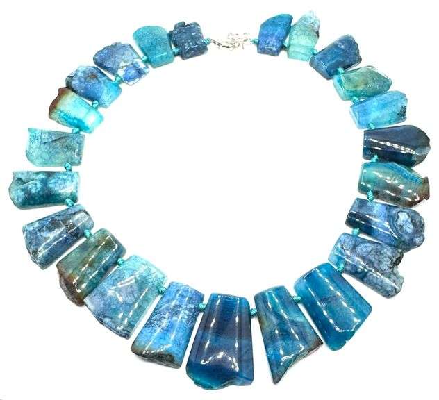 Sterling Silver Chunky Polished Blue Agate BOHO Necklace, stamped 925 on clasp. Measures 24in long and has a total weight of 9.32oz