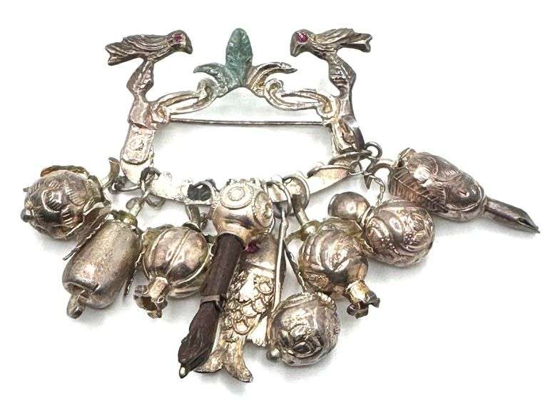 Gerson Bahia Sterling Silver Penca Balangandan Amulet Brooch. This unique detailed piece is in good condition and stamped GERSON BAHIA 925 on backside. It measures approximately 3.25in x 2.25in and has a total weight of 1.32oz