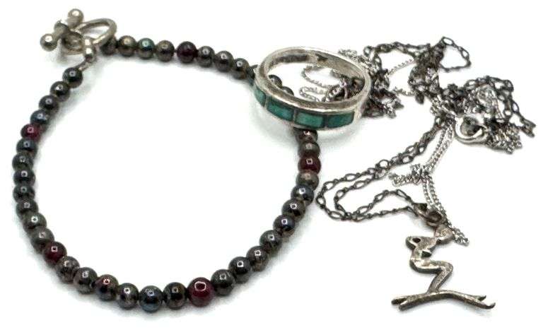 Sterling Silver Turquoise Inlay Ring, Beaded Bracelet, Pendant and Chains. Ring is size 6.5, all items are stamped sterling or 925. Total combined weight of 0.42oz. (GR2)