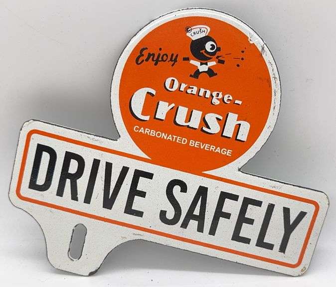 LOT 53 - Porcelain Orange Crush Soda Drive Safely License Plate Topper