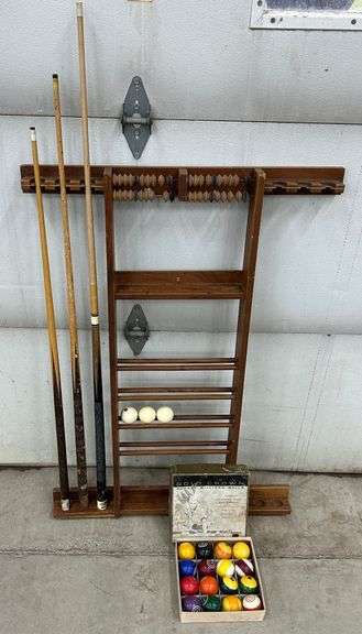 LOT 767 - (M) Billiards Wall Rack, Brunswick Gold Crown Pocket Billiard Balls, & More