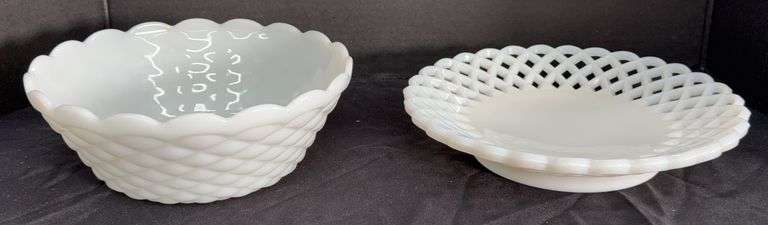 LOT 529 - (K) Fenton Lacy Edge Milk Glass Bowl & Anchor Hocking Scalloped Rim Quilted Diamond Serving Bowl