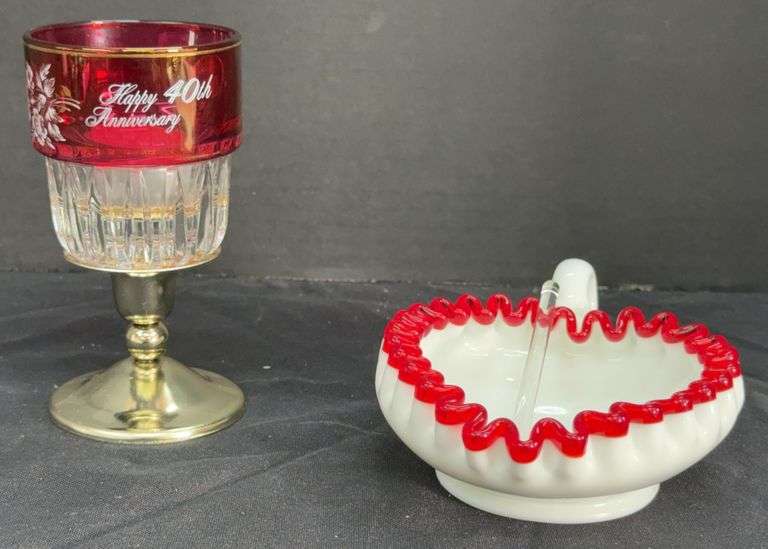 LOT 530 - (K) Metal Glow By Galow Ruby Wedding Anniversary Wine Glass & Fenton Ruby Crest Heart Dish