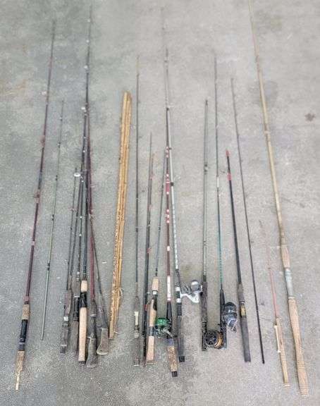 Variety Of Bamboo, Fiberglass, Metal, And Graphite. 4 Reels included. Fly Fishing, Johnson Century, Shakespeare Rainbow, And Mitchell 210. Some Part And Tips Missing Or Broken. Longest On Piece Pole Measures 90".