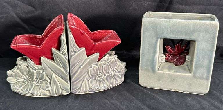LOT 579 - (F) McCoy Pottery Arcature Double Vase With Bird And Tulip Planter Bookends