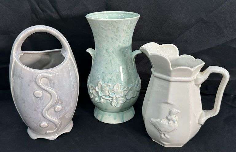 Includes McCoy Floral Brush Vase, Bisque Vase With Handle, And McCoy Country Water Pitcher Vase