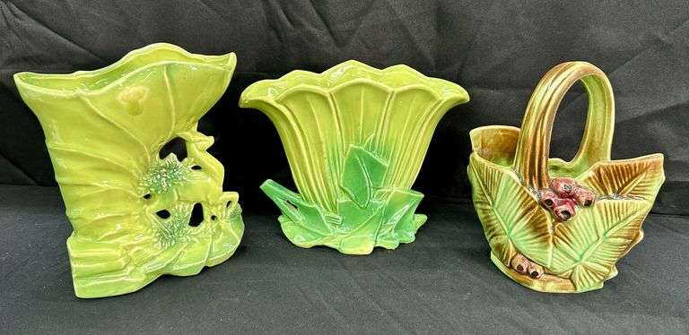 LOT 586 - (F) McCoy Pottery Fawn Planter, Berries & Leaves Basket Planter, And Tulip Fan Vase