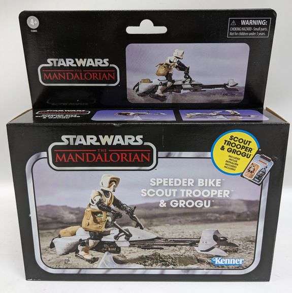 LOT 146 - Kenner Star Wars Mandalorian Speeder Bike Scout Trooper & Grogu In Box