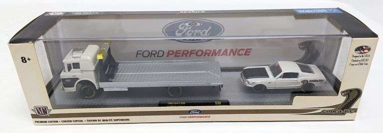 LOT 256m - M2 Machines Auto Haulers 1966 Ford C-950 & Mustang Cobra Jet 1:64 Die-Cast In Box w/ Display Case