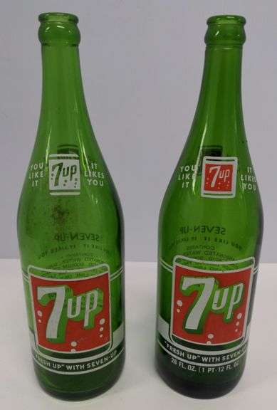 LOT 338 - 2 Vintage 1968 7up (1 Pint 12 oz) Green 12" Soda Bottles (Excellent Label Paint Condition)