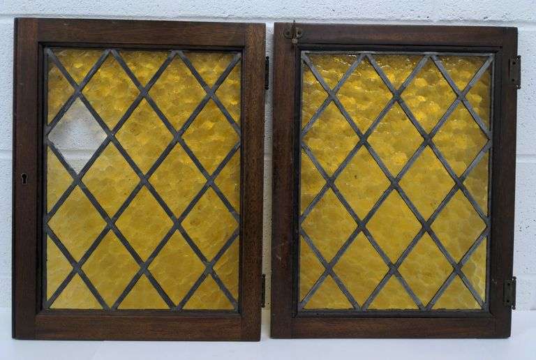 LOT 339 - 2 Vintage Amber Diamonds Leaded Stained Glass Doors (missing one diamond panel) each door measures 14.5" x 18.5" x .75"