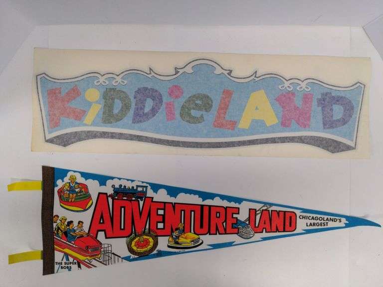 LOT 349 - Vintage Kiddie Land Decal (24" x 7") and Adventure Land Pennant (25" x 8") Old New Stock